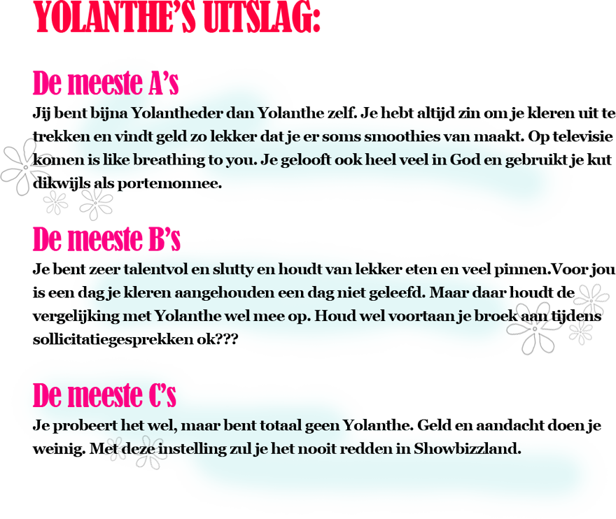 Ze is een van de populairste presentatrices in de geschiedenis, en wordt door honderdduizenden mensen aanbeden. Ze heeft niet alleen veel talent, stijl en borsten, maar zet zich ook nog eens in voor goede doelen. Voor veel mensen geldt ze als de ideale schoondochter. Zij is eigenlijk wie iedereen wil zijn. Maar hoe yolanthe ben jij eigenlijk? Tim den Besten maakte voor jou deze handige zelftest.