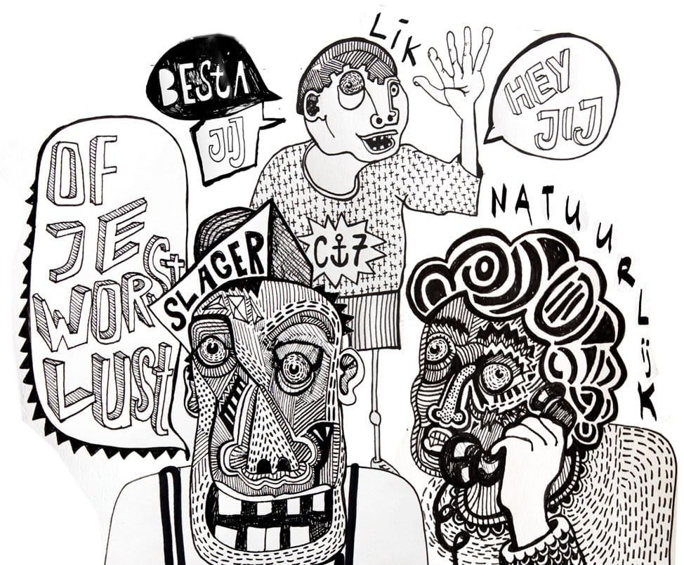 k moet hard weggerend zijn zonder om te kijken want ineens was ik in een vreemde buurt waar het rook naar verkoold schoeisel. Er was een speeltuin voor mensen boven de zestig en de katten droegen truien met de kop van Charly Chaplin erop. Midden op het plein stond een enorme boom met in de takken wel honderden huisjes. Mensen zwaaiden en vroegen of ik bestond. Ik knikte van ja maar kon het niet met zekerheid zeggen. Ik mocht naar boven klimmen als mijn hart nog heel was. Zo niet dan moest ik een mondkapje omdoen. Liefdesverdriet is besmettelijk. Op één van de takken stond een huis met parkieten, bloemetjesbehang en voor de deur hing een luchtfiets. De vrouw die daar woonde stelde zich voor als mijn tweede moeder. Ik lachte en probeerde mijn tranen in te slikken wat moeilijker ging dan normaal bij een glas sinas of een glas kraanwater.