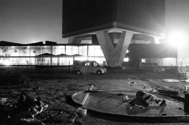 “You see the building over there?” Hij wijst naar het nieuwe Filmmuseum. “I like that building. It looks like a giant Pokémon. There aren’t enough buildings in the world that look like giant Pokémon. The building we occupy looks more like a nazi headquarters.” Dorst: “How did it feel to break into this building?” “At first most of the people were timid. Some of them checked out only a couple of rooms, but I was all over this fucking building. All day and all night, running around and gathering shit. In the basement the floor panels are all shaky, wobbling and at some places it collapsed already. You can see through and there is all this toxic stuff underneath the floors, so scary! And there’s also a disco room. I think that’s where they were entertaining their potential employees and stuff. Pretty wild!”