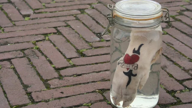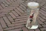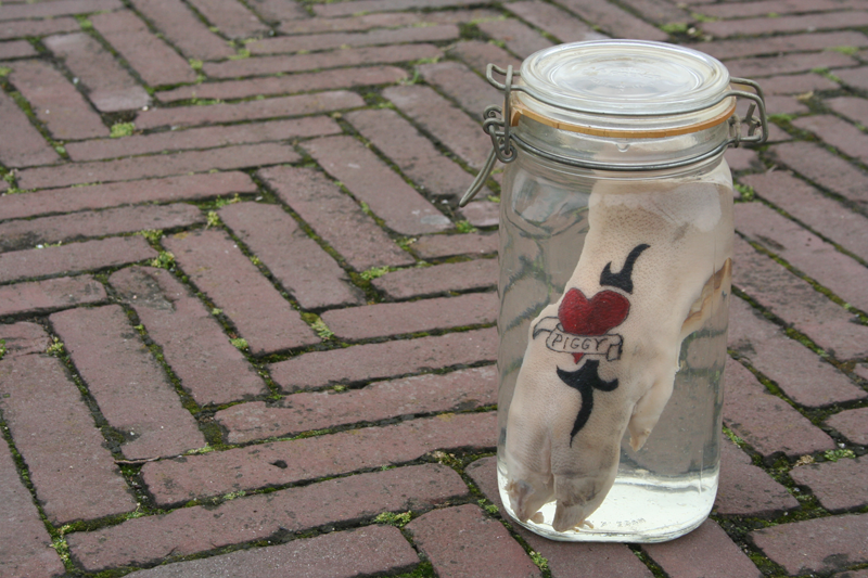 In de shop staat een pot met daarin een varkenspoot op sterk water. Op de poot zette Jasmijn een van haar eerste tattoos: een hartje met de tekst mama. “Maar” vertelt Jasmijn, “mijn allereerste tattoo zette ik al toen ik tien was. Mijn zus, een vriendinnetje en ik waren bang dat we elkaar niet meer zouden zien als we later groot waren. Daarom kozen we een datum ver in de toekomst, waarop we elkaar zouden ontmoeten.” De meisjes spraken af dat ze elkaar op 1 januari 2000 onder de Domtoren in Utrecht zouden zien en prikten “112D” op elkaar polsen met behulp van een naald en oost-Indische inkt.