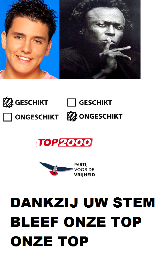 Daar is de top voor alle echte Nederlanders! Radio 2 en de Partij voor de Vrijheid hebben godzijdank een geniale campagne gevoerd om de top2000 weer zo blank als mogelijk te houden, en dat is wel zo fijn.