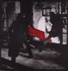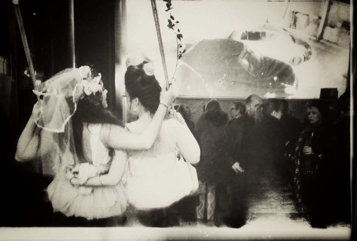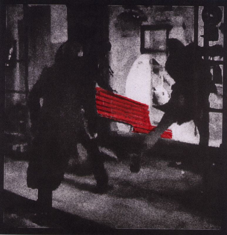 Daar stond ik dan, het was donker en koud op straat, maar ik gloeide. Een stuk of tien man kwamen in circusachtige pinguïnjasjes aangelopen, ze hielden een rood bankje vast. Zo’n bankje dat je wel eens in een park ziet staan. Ze zwaaiden het heen en weer en sloegen daarmee de ruiten van de galerie kapot. ‘We zijn begonnen’ dacht ik.