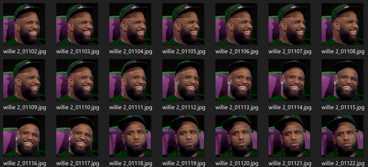 Toen probeerden we een andere aanpak. We trainden een nieuw model met meer consistente beelden (5000 still frames uit een interview met Willie Wartaal). Dit werkte wat beter: de output leek deze keer wel op Willie, maar was weinig gevarieerd en visueel niet zo interessant.