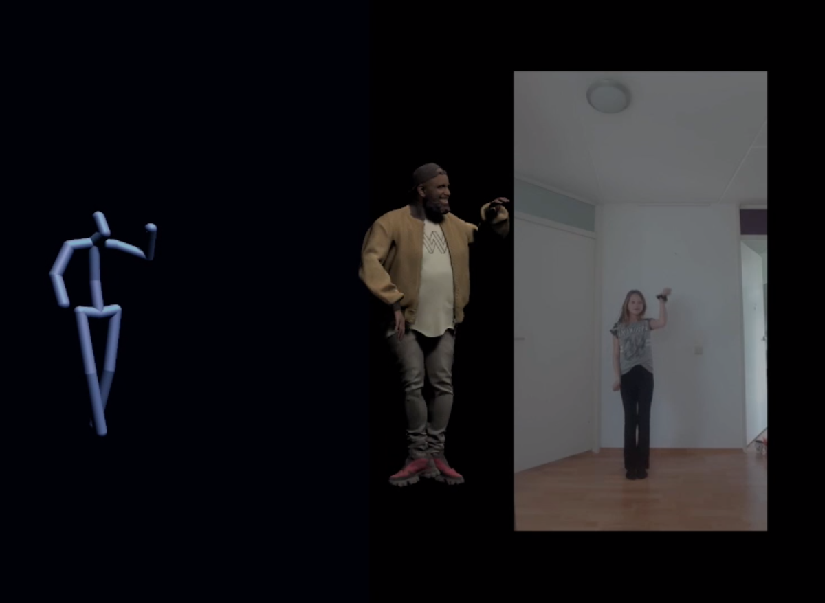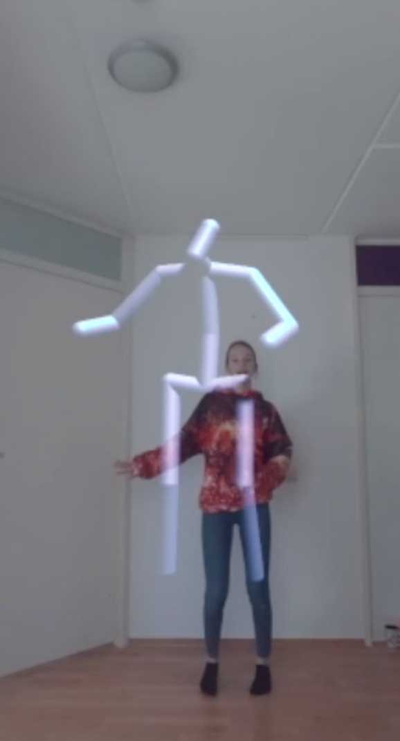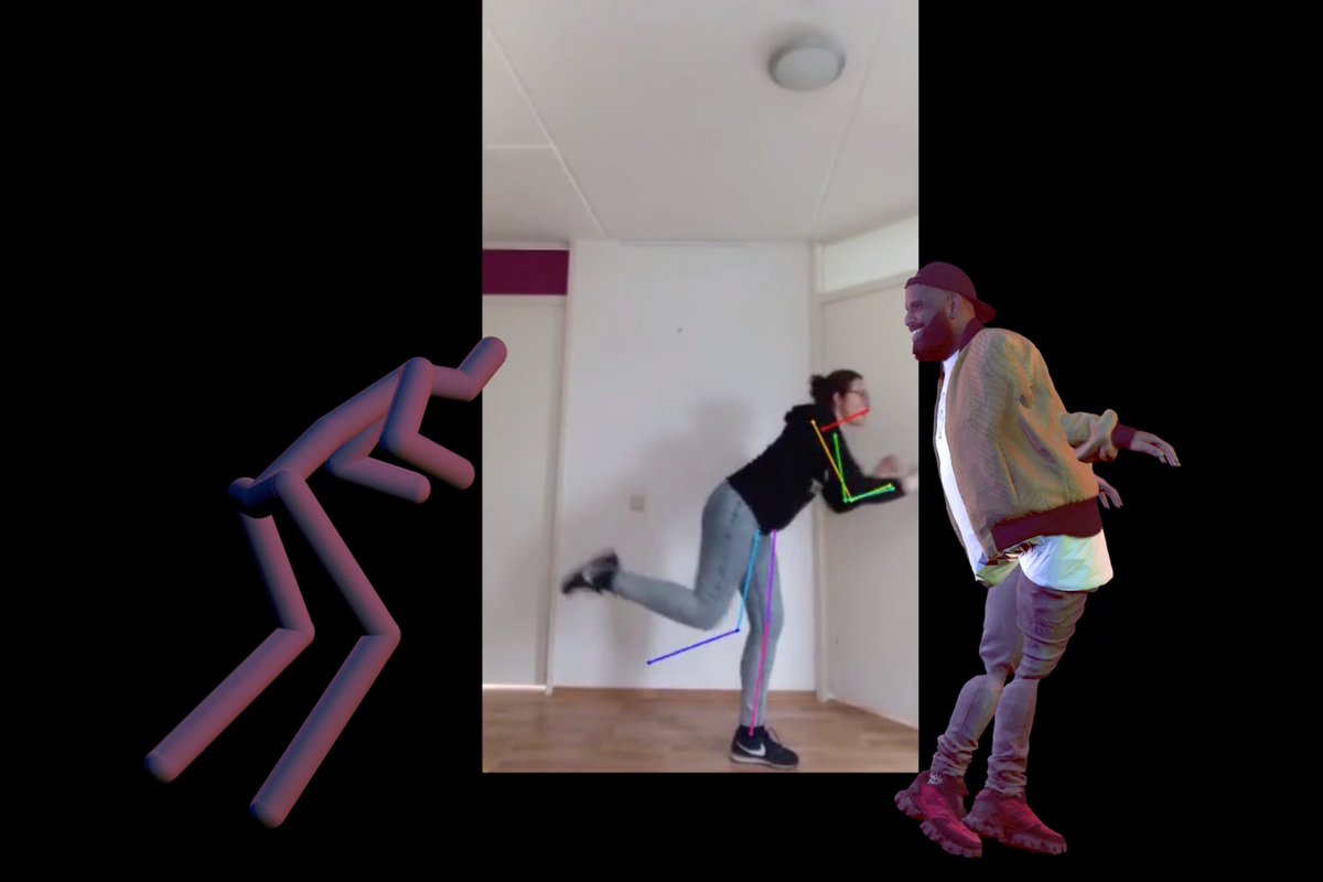 Om ons 3D-model te leren dansen, hadden we natuurlijk goede dance-moves nodig. En waar vind je die tegenwoordig? Op TikTok. We verdeelden Abbus in vijf delen en vroegen mensen om op het nummer te dansen. Van deze bewegingen maakten we een choreografie. Vervolgens trackten we de bewegingen met PoseNet, een model dat de houding van een persoon kan inschatten op basis van de ijkpunten van de bewegende gewrichten in hun lichaam op een tweedimensionaal vlak.