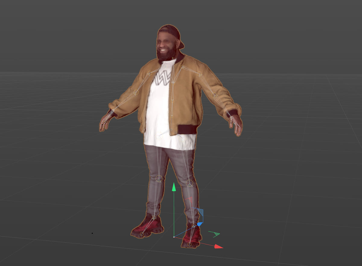Nu we een dansend poppetje hadden was de volgende stap om deze bewegingen te koppelen aan het 3D-model van Willie. Dit was makkelijker gezegd dan gedaan. Het genereren van het stokpoppetje is gebaseerd op de positie van de ijkpunten. Maar ons 3D-model van Willie wordt los gegenereerd en de ijkpunten moeten zijn lichaam volgen. Uiteindelijk kwamen we tot het volgende resultaat, door de natuurlijke rotaties van gewrichten losjes te simuleren vanuit de posities van de ijkpunten. Misschien zijn er slimmere manieren om de ingeschatte houdingen weer te geven, maar deze manier leverde ons gekke, schokkende, bibberende bewegingen van Willie op, die eigenlijk wel een tof effect gaven. Dus we hebben deze methode omarmd.