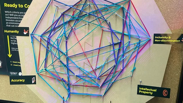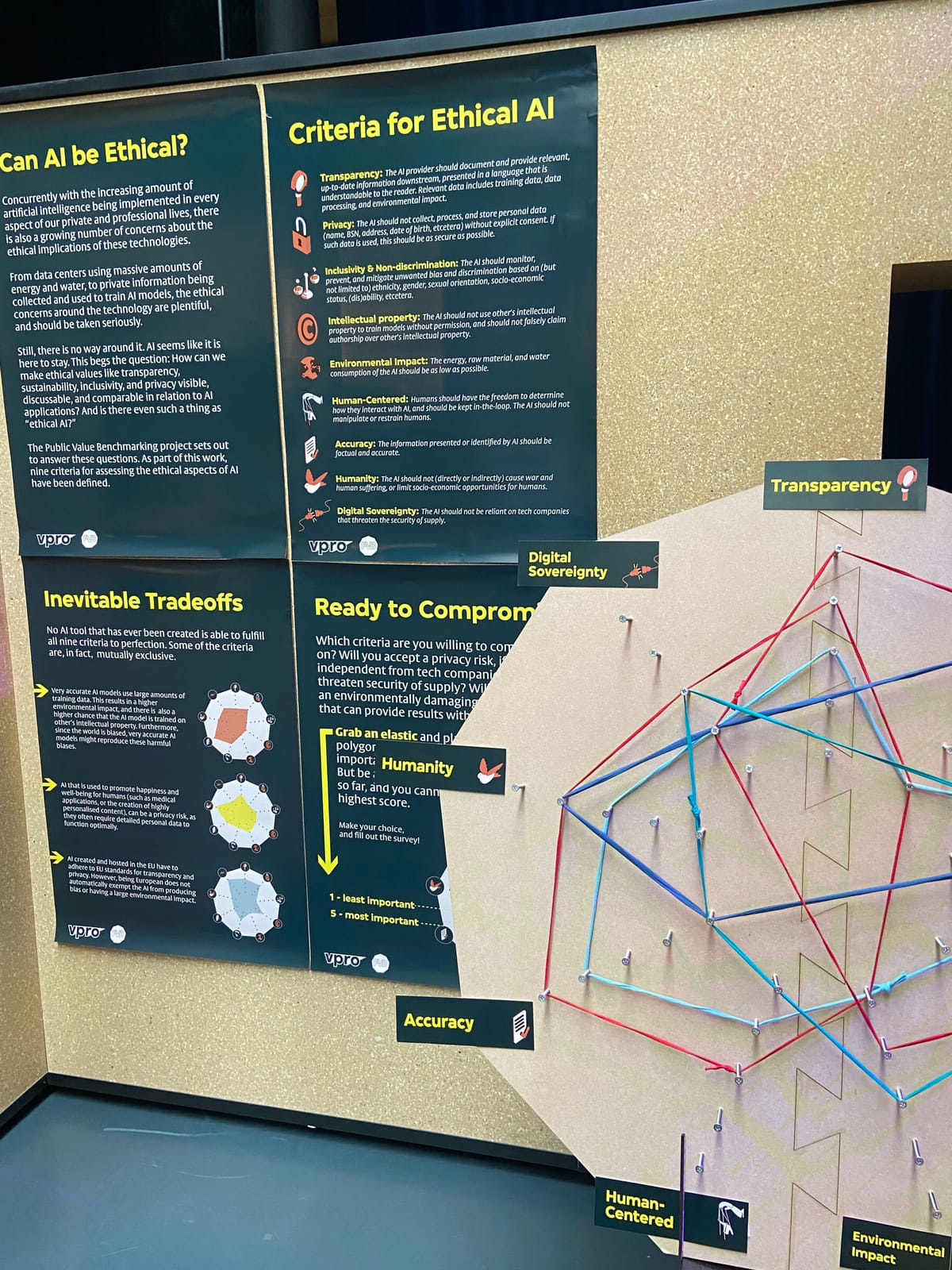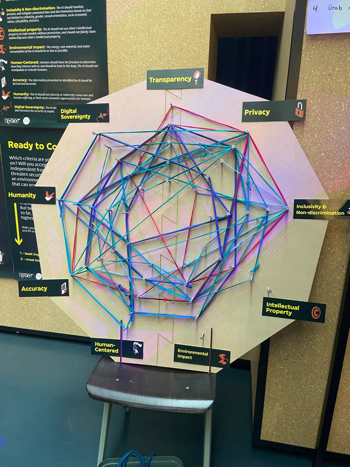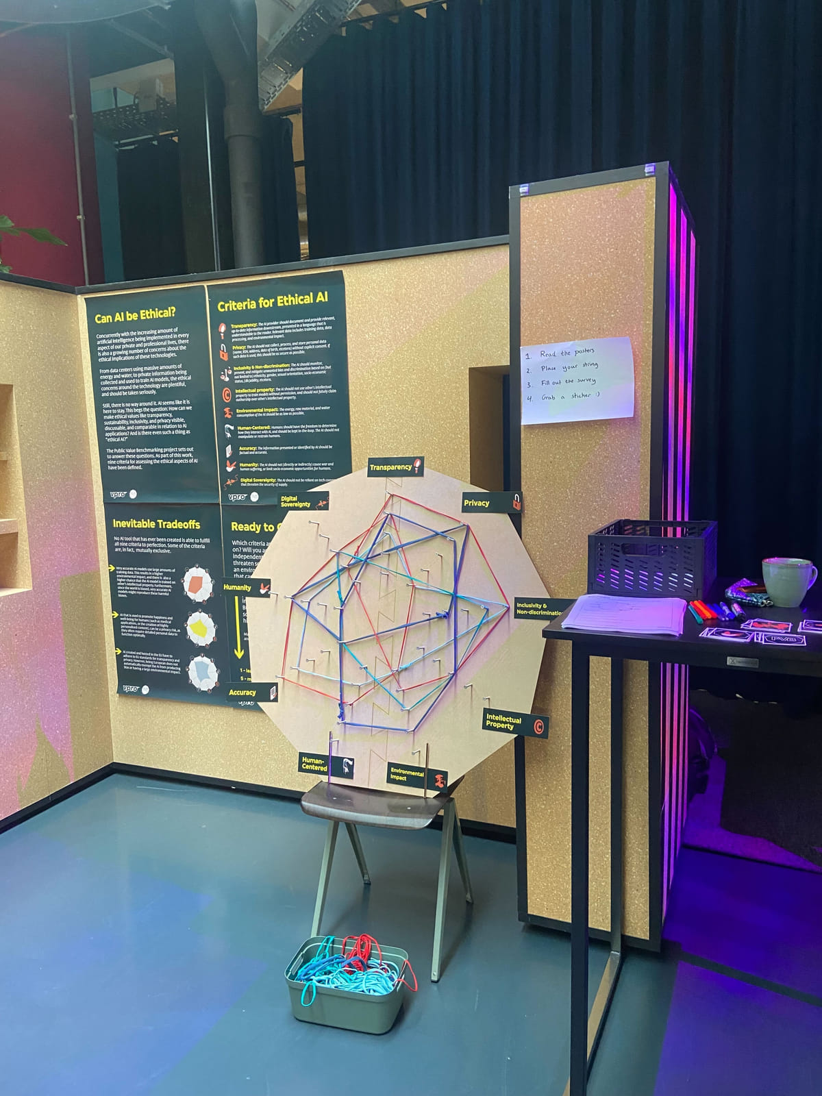 Here, visitors were asked to actively consider which ethical criteria they prioritise when choosing an AI tool, by placing a string on a polygon, creating a spider diagram. The strings had a fixed length, making it impossible to give every criteria the highest score, thus provoking questions like: Will you accept a privacy risk, if the AI is independent from tech companies that threaten security of supply? Will you tolerate an environmentally damaging technology that can provide results with high accuracy?