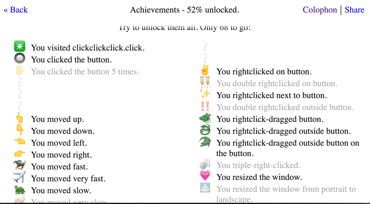 Inderdaad: ondertussen rijg ik de achievements aan elkaar. Drie keer klikken op de button, het scherm vergroten, stilstaan voor een minuut, noem het maar op. Wat is daar allemaal de bedoeling van?