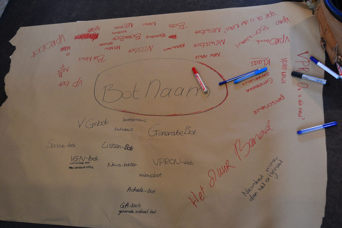 Zonder tijd te verdoen aan lange introducties, beginnen we op donderdagochtend met de klassieke brainstorm. Iedereen moet zo veel mogelijk ideeën voor bots op post-its schrijven en die op de muur van het Medialab plakken. Binnen no time is die gevuld met gekleurde papiertjes. Het aantal woordspelingen met ‘bot’ blijkt oneindig. Er zijn voorstellen voor Ben Bot, de botte bot en Berend Botje. Uiteindelijk groepeert projectleider Annelies Termeer de ideeën in verschillende categorieën en verdelen de hackers zich over de groepen. Nog geen uur na het openingswoord worden de laptops opengeklapt en kan het hacken beginnen.
