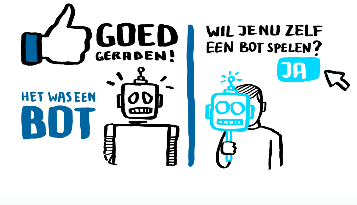 Een team vroeg zich af of mensen zouden herkennen wanneer ze met een bot chatten of een mens. Ze vroegen deelnemers aan de Hackaton om via de Facebook messenger te praten en binnen 2 minuten aan te geven of de ander een bot of mens was. Een bot nadoen bleek lastiger dan verwacht!