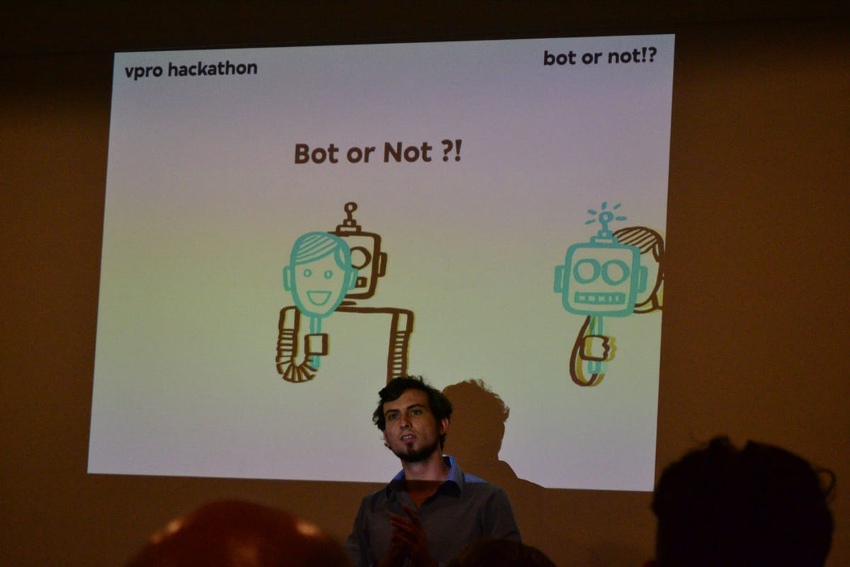 Eerdere hackathons gingen over virtual reality, muziek en gezichts- en emotieherkenning. Deze twee dagen in september gaat de VPRO op zoek naar een bot. Een bot is een computerprogramma dat op een persoonlijke manier direct met de gebruiker communiceert. Zo zijn er al veel bedrijven die bots gebruiken als klantenservice, maar ze zijn ook handig als nieuwsvoorziening, psycholoog of agendahulpje. Een goede bot werkt met kunstmatige intelligentie: hij leert van zijn gebruikers en wordt zo steeds slimmer en beter in zijn vak. In de toekomst zullen mensen steeds meer gaan communiceren met robots, maar het gesprek verloopt nu nog niet altijd even vlotjes. Bots begrijpen mensentaal vaak niet goed, wat leidt tot frustraties.