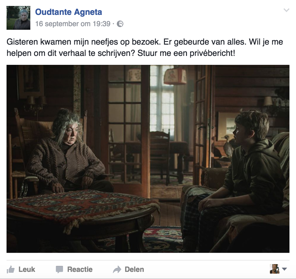 Het team van De Verhalenmakers vroeg zich af hoe het zou zijn om samen met je favoriete personage uit een VPRO serie een aflevering te schrijven. Hiervoor maakten zij van Oudtante Agneta uit de serie Eng een bot. Spreek Oudtante Agneta aan op Facebook en schrijf samen een nieuwe aflevering!