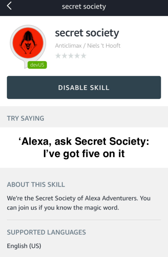 Door een geheimtaal te ontwikkelen met flarden poëzie, quotes en fragmenten uit literatuur wordt Alexa aangesproken op een manier die alleen door insiders te volgen is. De gebruiker is hiermee deelnemer van een geheim genootschap.