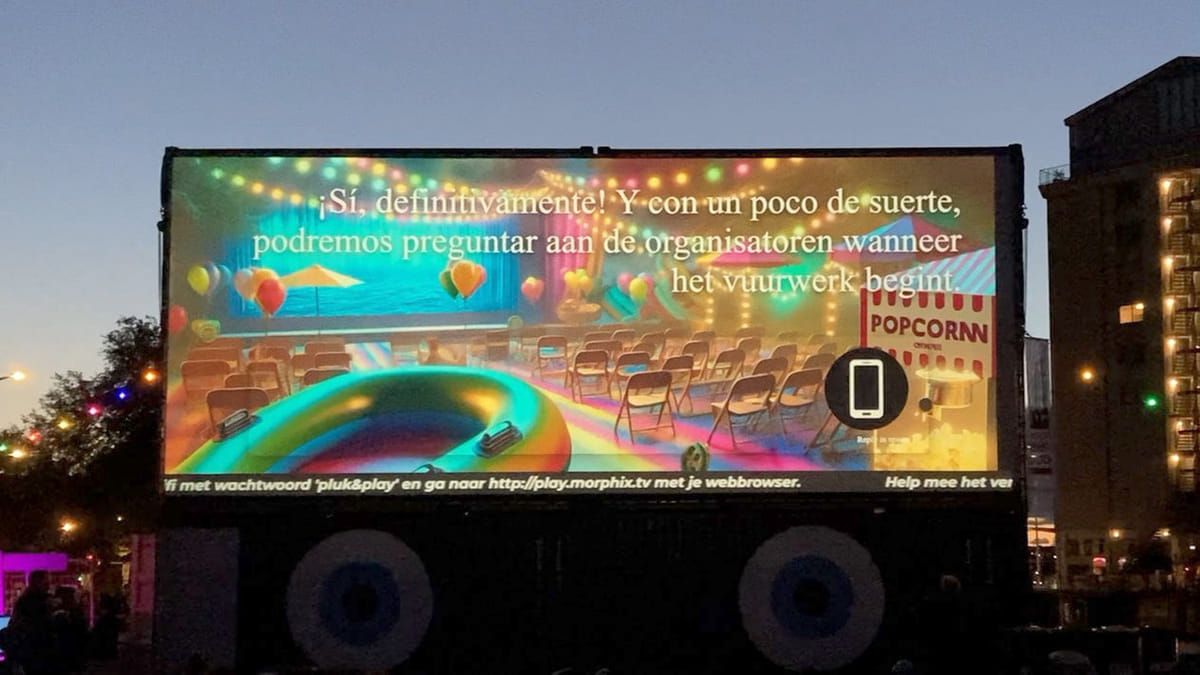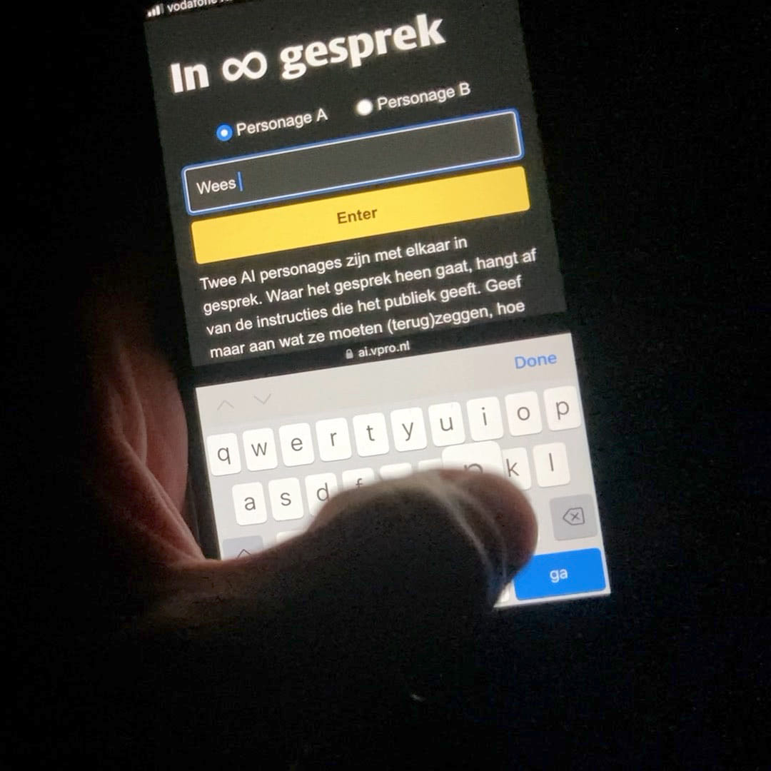 Voor mij als maker bij VPRO Medialab is dat wat dit project bijzonder maakt. Ik ben publiek van m’n eigen creatie. Elke avond is het weer spannend hoe het verhaal zich ontwikkelt. Waar komt de AI mee? Voelt het publiek zich goed uitgedaagd om slinks de dialoog aan te sturen? Al observerend heb ik al wel wat tweaks doorgevoerd. Tijdens de try-out hadden de stemmen zelfs geen kennis over zichzelf. Al gauw werden ze door het publiek tot Bert en Ernie omgedoopt, waarna het verhaal niet meer op een ander spoor kwam. Sinds die avond zit er in compacte initiële prompt wel een beknopte karakterschets. Het zijn nu acteurs die een rol gaan vertolken in een film die in een openluchtbioscoop vertoond gaat worden. En dat is geen fictie, maar echt.