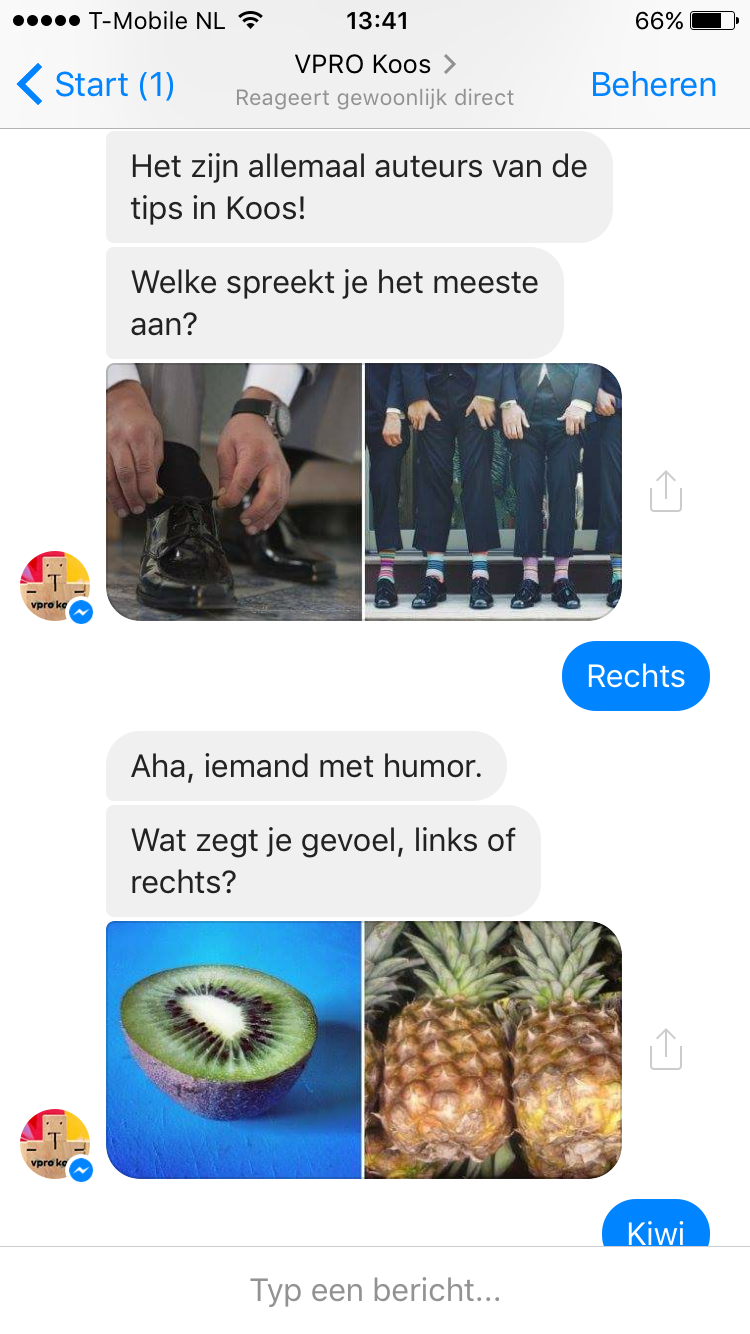 Toevallig viert de app Koos deze maand zijn eerste verjaardag, een mooi moment om Koos de Bot te introduceren. Iedereen met een Facebookaccount kan communiceren met de bot en daardoor kennismaken met mediatips die echt bij hem of haar passen. En al is het een bot, er bestaat een goede kans dat er iets moois tussen jullie opbloeit. Probeer het maar eens.