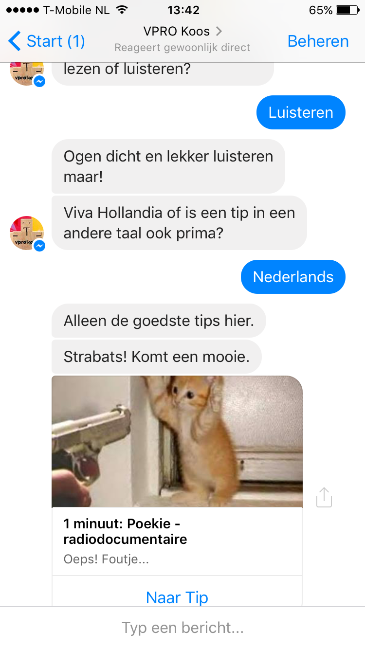 Samen met drie medewerkers van de startup Bot Boys ontwierp ik daar in twee dagen een bot die door middel van keuzes een tip uit het VPRO-archief opdiepte. Het idee sprak aan en werd later verder uitgewerkt. Om dat het algemene VPRO-archief veel te groot is, werd gekozen voor iets behapbaarders: de tips van VPRO Koos.