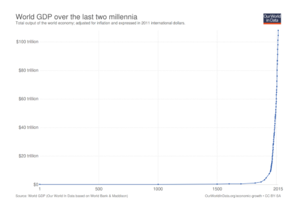 Deze fascinerende grafiek toont het welvaartsniveau van de mensheid in de laatste tweeduizend jaar en wordt vaak aangehaald als het gaat over technologische vooruitgang.