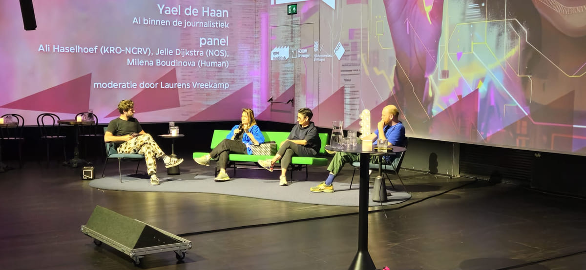 De panelleden Ali Haselhoef (KRO-NCRV), Milena Boudinova (HUMAN) en Jelle Dijkstra (NOS) gaven aan dat AI vooral gezien moet worden als een opkomende tool die journalistiek werk kan vergemakkelijken. Zo legde Ali uit dat AI kan helpen om fouten in audio-opnames te corrigeren zonder dat nieuwe opnames nodig zijn. Milena benoemde het belang van Omroep HUMAN om mensen bewust te maken over de impact van AI, bijvoorbeeld via nieuwe programma’s zoals AI-Love, waarin mensen gevolgd worden die een (liefdes-)relatie hebben met AI-partner. Voor de een nieuwsorganisatie als NOS blijft het essentieel om een duidelijk onderscheid te maken tussen wat AI gegenereerde content is en wat niet. De laatste check in het nieuwsproces moet altijd menselijk zijn.