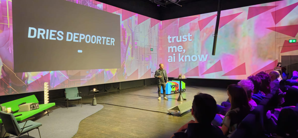 Kunstenaar Dries Depoorter bracht een creatieve invalshoek met zijn werk rond privacy, AI, surveillance en social media. Met een interessante overview van zijn werk verraste hij het publiek met een leuke live demonstratie van zijn zelfgemaakte bots. Zijn projecten ‘The Follower’ en ‘The Flemisch Scrollers’ lieten zien hoe AI op innovatieve en soms confronterende manieren maatschappelijke kwesties aan de kaak kan stellen.