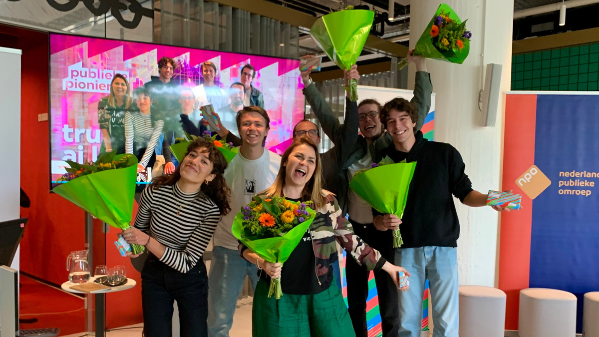 Na een sterke pitch was de jury overtuigd: team HUMAN verdient de eerste prijs! Het team wist de jury te overtuigen met een waardevolle eye-opener over vertrouwen en media met behulp van AI. De omroepmedewerkers van HUMAN hebben samen met vier studenten en een onderwijskundige hun hersens gekraakt over het belang van vertrouwen in publieke media. Ze bedachten 'UnwrApped', een tool ontwikkeld voor jongeren om inizcht te krijgen in hoe het algoritme hen beïnvloedt. Hun benadering om bewustzijn te creëren in de maatschappij over de schokkende hoeveelheid data die socialmediaplatforms over jou opslaan en doorverkopen, toonde een kritieke noodzaak. Hulde!