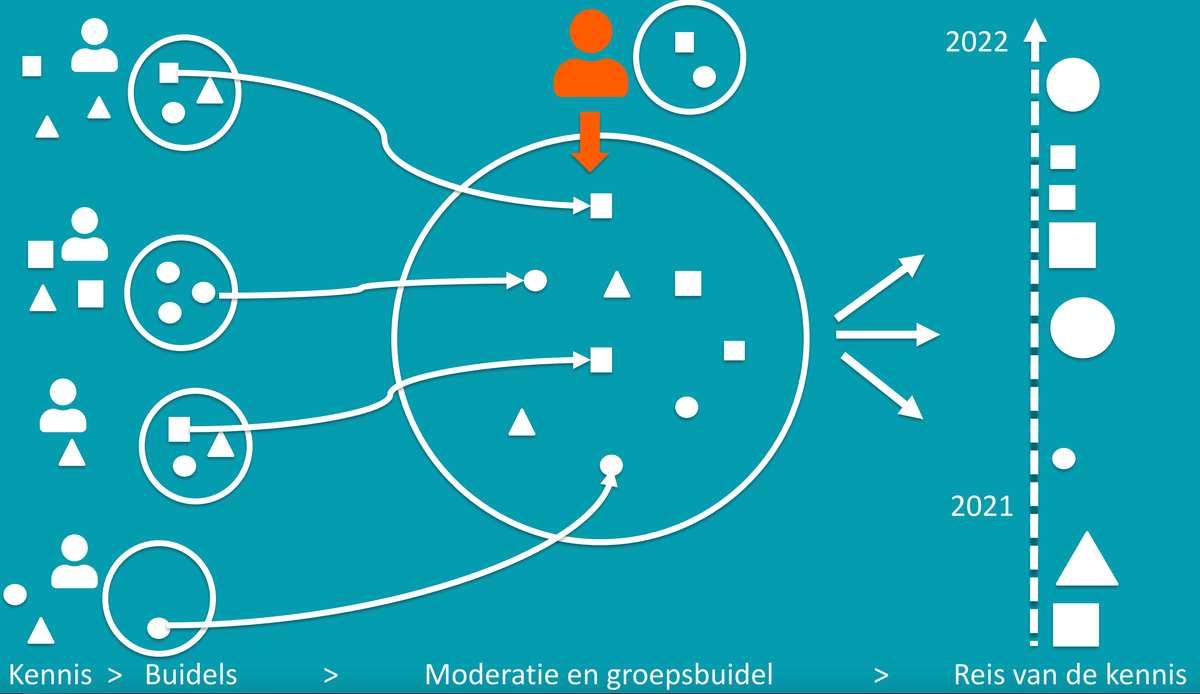 In het team van Marlijn Gelsing (KunstLoc Brabant), Bram van den Heuvel (BLM Groep), Bram Kluen (Rozet Bibliotheek) en Michiel Klønhammer (LearningStone), werd nagedacht over een manier om het wordingsproces van kennis inzichtelijk te maken binnen KennisCloud. Zoals ze het in hun pitch verwoordden: "Wij willen de reis van kennis laten zien om de impact te vergroten". Hoe leidt de inbreng en uitwisseling van informatie via blogs, meetups en videos tot kennis. Kan een slimme tijdlijn, door een algoritme dynamisch gegenereerd, inzicht geven in hoe kennis zich ontwikkeld? In dit team kon Bram van de Heuvel met wat hulp van Rob van den Bogaard (DrieBit, ontwikkelaars van KennisCloud) een eerste prototype ontwikkelen.