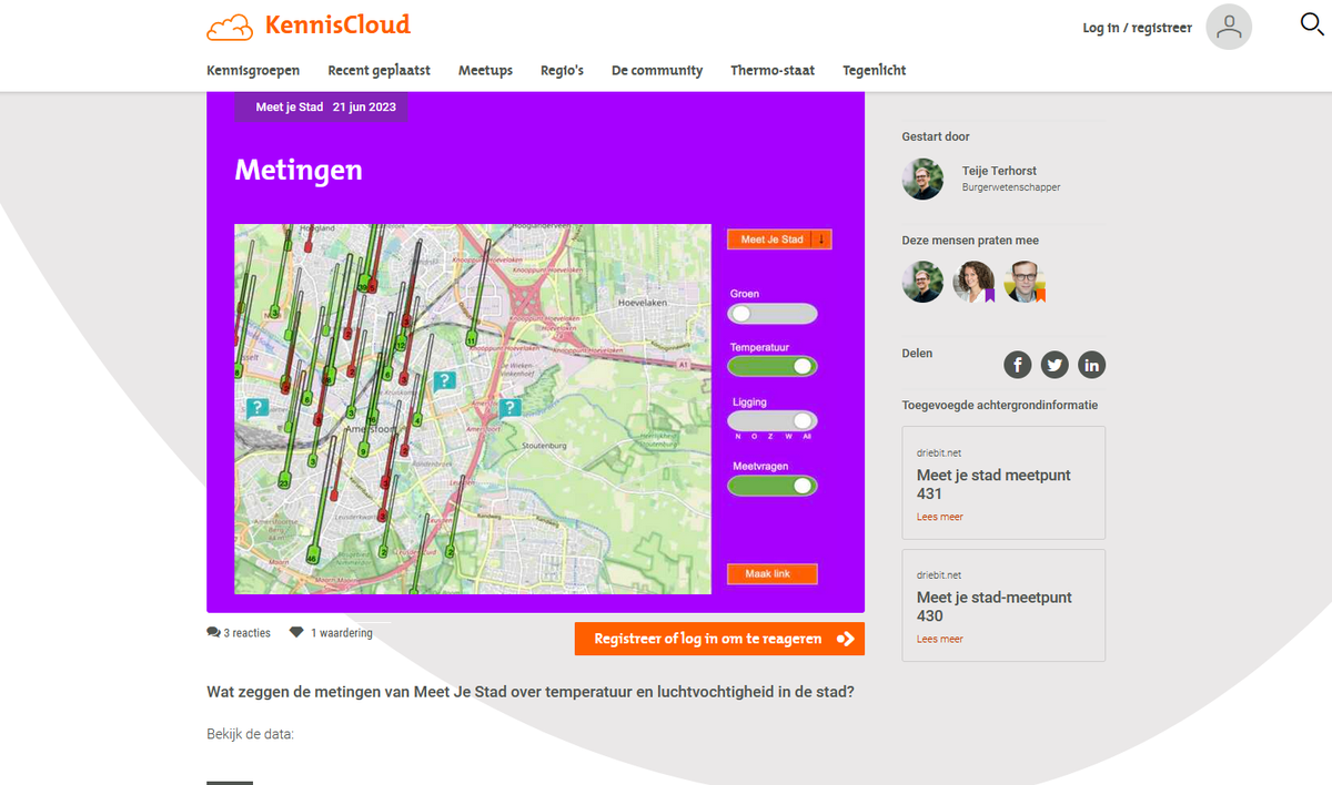 In dit team werkten de Bibliotheek Midden-Brabant, WAAG Futurelab en de Universiteit van Amsterdam samen aan oplossingen om burgerwetenschap in KennisCloud beter te faciliteren. David Oldenhof, Anouk Nuijten, Teije Terhorst en Miriam van den Beemt bedachten een manier om met visuele middelen als kaarten en datavisualisaties de deelname aan burgerwetenschap te stimuleren. De gedachte is dat de pesoonlijke inbreng en relevantie wordt versterkt wanneer verzamelde data herkenbaar en localiseerbaar is.