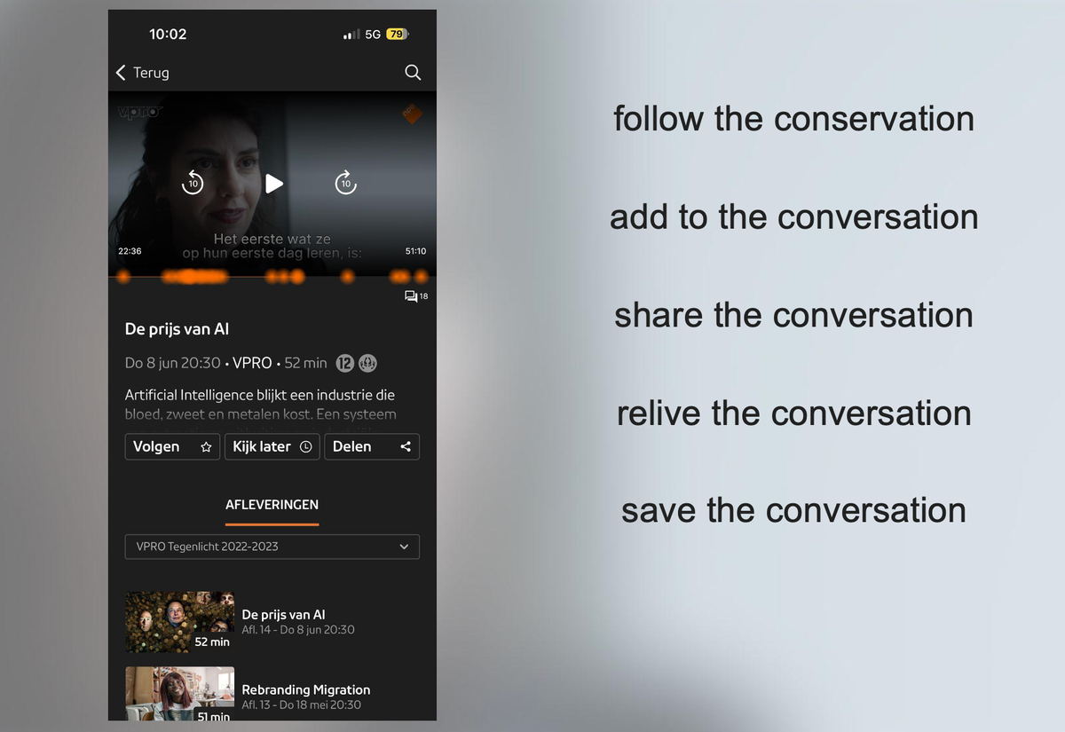Vanuit de VPRO had zich een team geformeerd met eindredacteur Tegenlicht Jasper Koning, designers Julia Veldman en Delyan Pragow, community manager Tara Vierbergen en developer Rogier de Ruijter. Met technische aassitentie van Jan den Besten en Harm van Stekelenburg, ontwikkelaars van PubHubs aan de Radboud Universiteit, kwamen zij tot een eerste prototype voor een discussietool gekoppeld aan een tegenlicht uitzending: Kongsi. Met de voorgestelde Kongsi plugin kun je live én achteraf (VOD) praten over een uitzending of video. Deze commenting-tool stimuleert live gesprekken, maar opent ook de mogelijkheid om later door te praten en de video met commentaar te verrijken. Uit de gesprekken ontstaat een heatmap van waar zich het debat concentreert, waar de hot-topics zitten. Zowel voor de redactie nuttig om feedback te oogsten als voor publiek om zich verder te verdiepen in een thema.