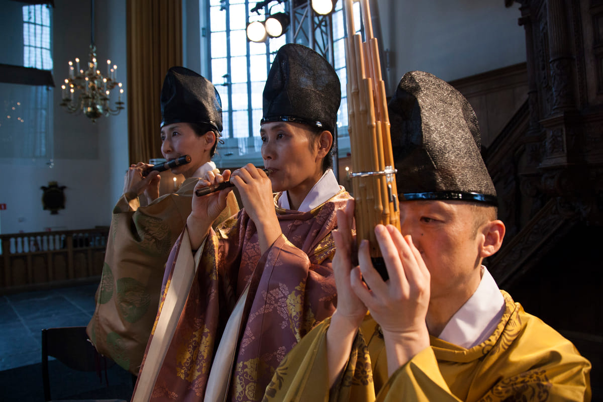 Alles is te horen, het verschuiven van een stoel, het kraken van de camera, het knorren van de maag. Het is zondagmiddag 14 februari, en het is muisstil in de Nieuwe Kerk op het Spui in Den Haag. Op het podium schotelen drie Gagaku-muzikanten ons bijna onbeweeglijk een rijk pallet aan klankkleuren voor die aan een muzikale zentuin doet denken.