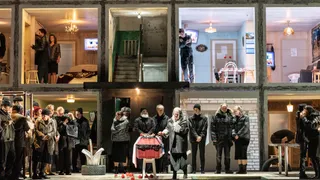 Hoe groter het leed, des te groter de liefde. Er ontvouwde zich op het podium een strak geregisseerde opéra noir in afwisselende decors gemaakt door Rufus Didwiszus: een keuken van de Keukenkampioen, een leeg toneel met enkel een schildersezel, en een gevangenis van steigerbuizen.