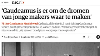 De Stichting Gaudeamus bestaat 75 jaar! Gaudeamus pakt uit met het veelzijdigste programma tot op heden. Zelfs in dit corona-jaar 2020 is er een ambitieus programma. De Gaudeamus Muziekweek 2020 - van woensdag 9 t/m zondag 13 september - presenteert avontuurlijke Nederlandse musici en componisten aan een wereldwijd publiek in een serie video’s. Een combinatie van online én fysieke concerten en activiteiten in en vanuit verschillende locaties in Utrecht: TivoliVredenburg, Het Huis Utrecht, Het Stadsklooster, de nieuwe Bibliotheek op de Neude, De Havenloods, Amelisweerd en Perron-E.