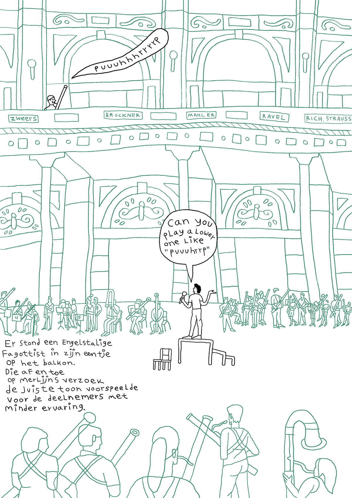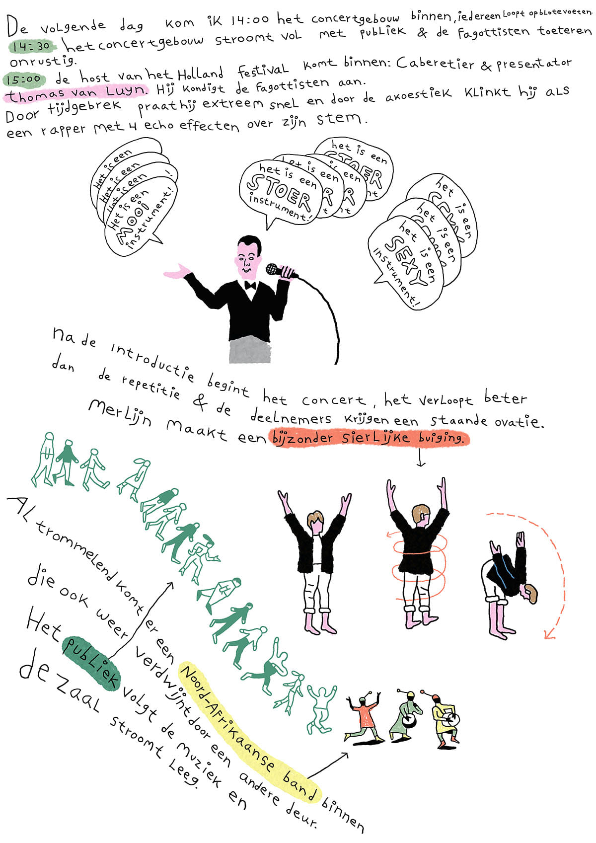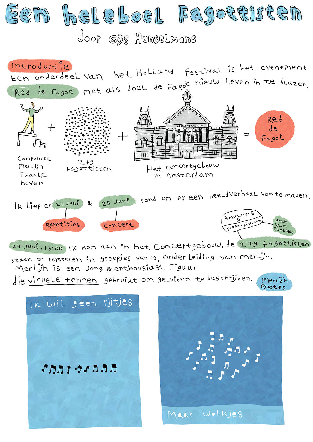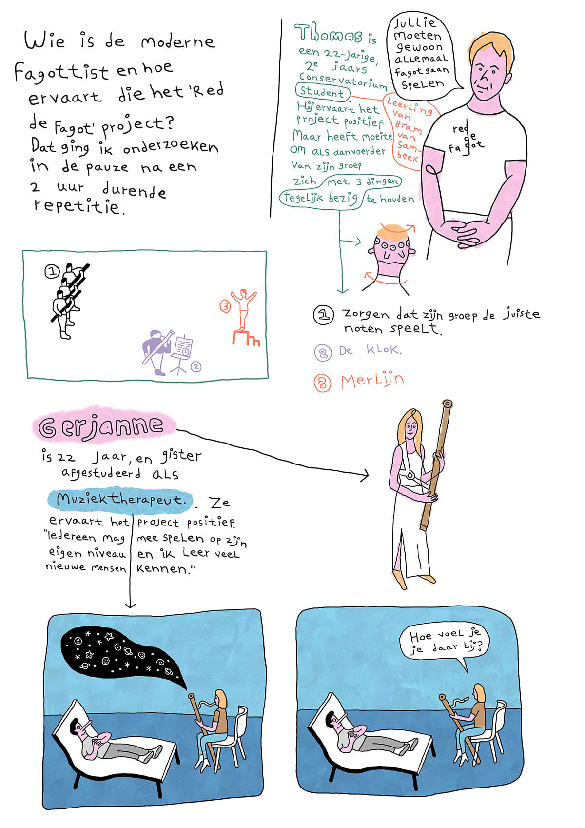 Het Holland Festival heeft componist Merlijn Twaalfhoven de opdracht gegeven om een compositie voor honderden fagottisten van elk niveau te schrijven. De wereldpremière vond plaats tijdens de Holland Festival Proms in het Concertgebouw. Het was de kroon op de campagne Red de Fagot. Iedereen, jong, oud, die fagot kan spelen, mocht meedoen. Verslaggever Gijs Henselmans is er naar toe gegaan en maakte voor VPRO Vrije Geluiden een superleuk beeldverhaal. Scroll naar beneden of klik op de pagina's.