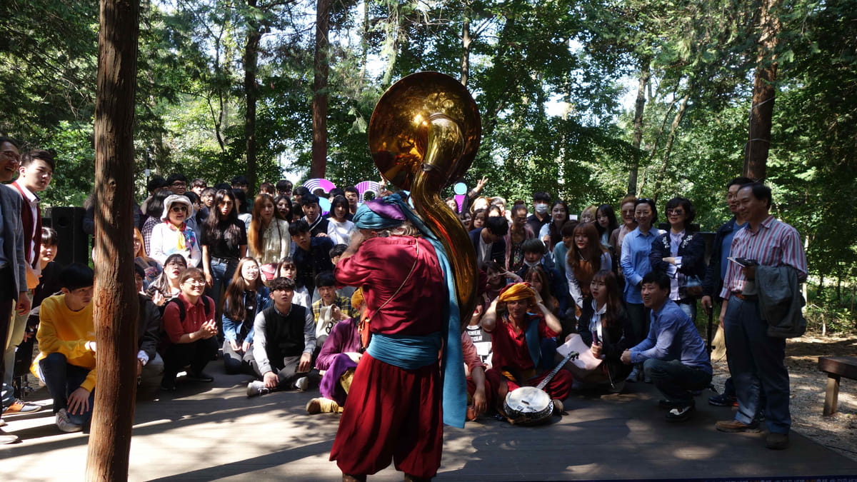 De Franse groep La Tit'Fanfare was een attractie op zich met die enorme tuba en opvallende kledij. Als voormalige straatband weten ze wel te communiceren met het publiek. Ik sprak met de banjospeler Sargam over hoe ontvankelijk het Koreaanse publiek is. Daarbij moet ik wel zeggen dat er veel ouderen in het publiek zitten. Vooral op de doordeweekse dagen. Er zijn ook schoolkinderen die de workshops volgen waaronder die van La Tit'Fanfare. Sargam vertelde me dat de kinderen uitzinnig reageerden. De mini-brassband speelt een mix van invloeden uit India, Turkije, Marokko en Frankrijk. De samenwerking met de pansori-zanger Taepyungyang yu was een enorme uitdaging voor ze. De zang en het ritme zijn totaal anders dan ze gewend waren. Het resultaat was een sterke vereenvoudiging van een lied waarbij de djembé een vast patroon speelde om niet uit de bocht te vliegen.