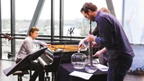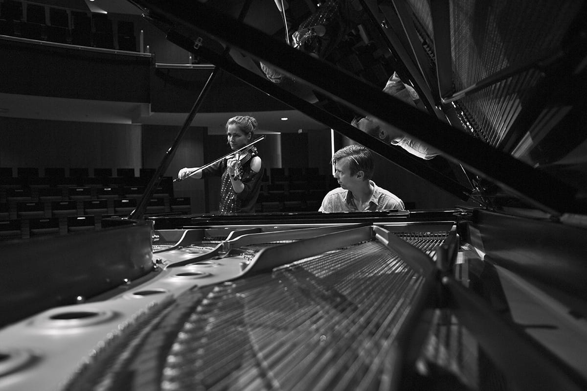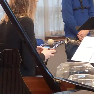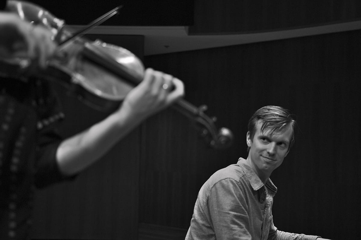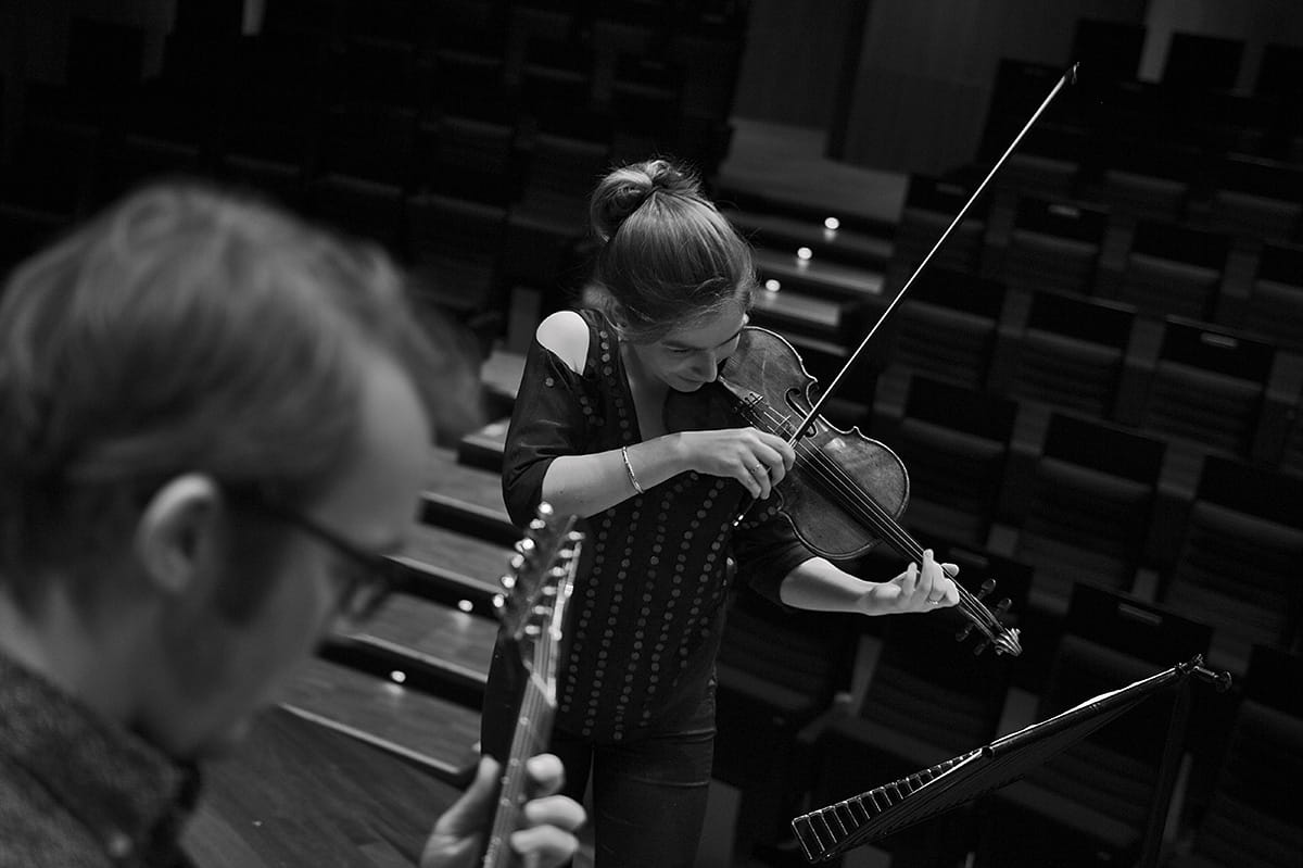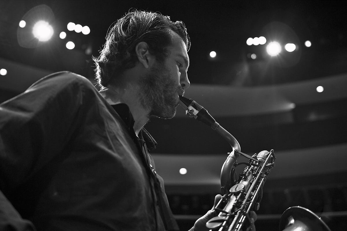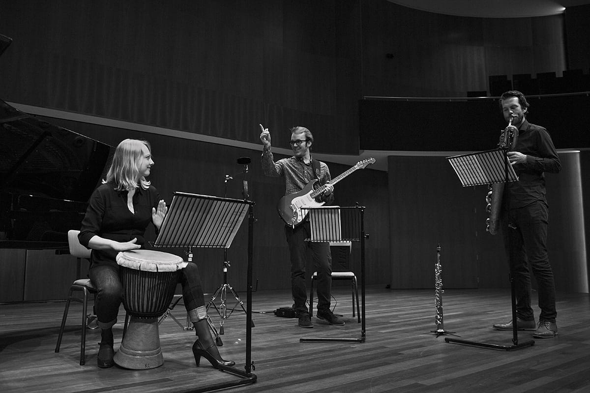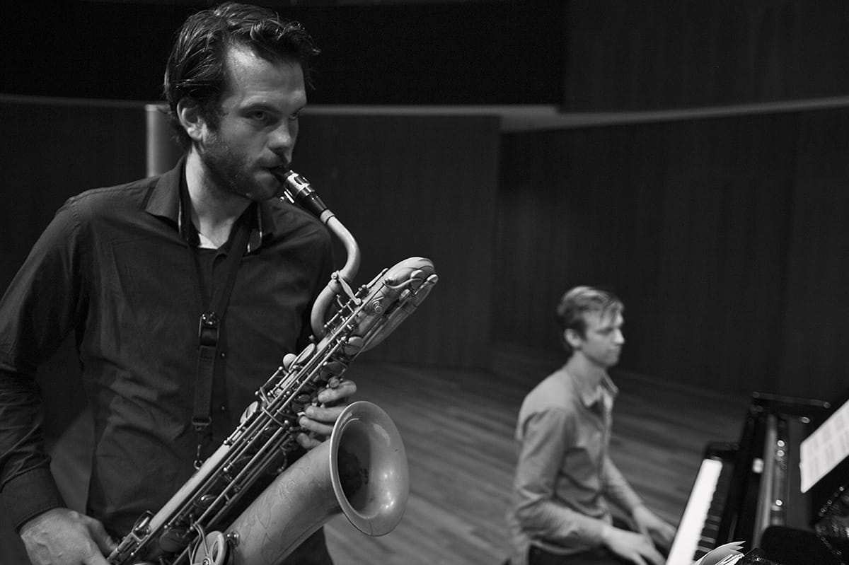 "In het moment voordat we gaan spelen, is vooral veel concentratie. Het is een split-second waarin je samen ademt, en dan begin je. De inzet van die eerste noot is ook afhankelijk van de instrumenten. Als Tim de toetsen van de vleugel induwt, is er direct een klank. De strijkstok van de viool moet even op gang komen voordat je iets hoort, net als de lucht die door de saxofoon gaat. Op dat verschil moet je inspelen."