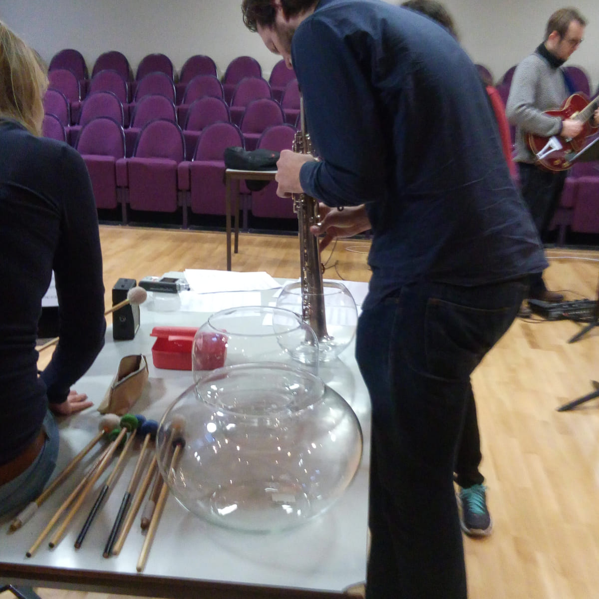 Yael Levy is degene die aan de slag is gegaan met vissenkommen. Het was voor haar nog een hele klus om de juiste kommen te vinden voor de gewenste toonhoogten. Jennifer is druk bezig geweest uit te zoeken hoe ze het beste op een vissenkom kan spelen en met welke stok ze het geblub van een vis het dichtst benadert. Ondertussen was Tim aan het stickeren in de vleugel...