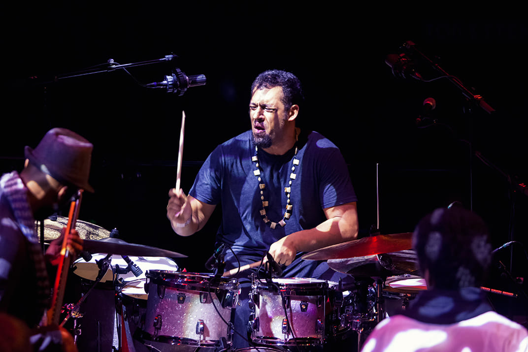 Makaya McCraven zelf drumt non-stop dwars door alles en iedereen heen. Maar hij voelt zich ook in de zachtere regionen thuis. Met zijn schorre stem refereert hij tijdens het optreden aan zijn onlangs uitgebrachte album 'In the Moment' waar uit 48 uur jammen (verspreid over een jaar) negentien stukken organische beatmuziek is gehaald. Wat Miles Davis vroeger ook deed met Bitches Brew. Ze spelen om dat te onderstrepen het stuk 'Sivad' van Miles. Een mooi staaltje standing on the shoulders of giants...