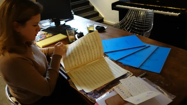 Zo'n vier jaar geleden kreeg ze tassen vol met nagelaten spullen van haar vader in handen: manuscripten, gedichten, foto’s, kaarten en partituren. Helena besloot het materiaal in te duiken en de nagelaten muziek in kaart te brengen. Meer dan twee maanden zou dat niet duren, dacht ze. Uiteindelijk is ze er nu al een goed halfjaar mee bezig. ‘Soms kom ik partituren tegen die onaf zijn,’ vertelt Helena. Ze toont een stuk waarvan alleen het einde is uitgeschreven. ‘Gelukkig had ik een video-opname waarop mijn vader dit stuk speelde. Zo kon ik de rest zelf uitschrijven.’ Die bezigheid deed haar wel beseffen dat het project wel eens langer kon gaan duren dan gehoopt. ‘Ik heb een dag gedaan over een paar maten, omdat ik nét niet precies kon horen wat hij daar speelde.’