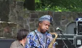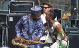 Orlando Julius vergaarde 50 jaar geleden (!) met de plaat Super Afro Soul niet alleen sterrenstatus in Nigeria, maar kreeg ook belangrijke invloed op muziek in de Verenigde Staten. Meer dan een halve eeuw in het vak, maar niet klein te krijgen, deze artiest-tot-in-de-vezels. Goedlachs tot en met, communicatief naar iedereen, ongelooflijk energiek. Je zou misschien verwachten dat hij het zware werk overlaat aan de jonge bandleden van The Heliocentrics - de Londense band waarmee hij regelmatig optreedt, en met wie we hem ook al eens opnamen in Groningen - maar nee hoor, hij houdt de lead en blijft in control. Okee, soms een beetje gestuurd door zangeres en danseres Latoya Ekemode, maar dat draagt eigenlijk alleen maar bij aan de charme van de man die niets liever lijkt te doen dan het feest op gang brengen voor het publiek. Met zijn vocalen - bijna meer spoken poetry dan melodieus zingen - maar net zo goed met zijn tenorsax laat hij de jongere garde ook een flink poepie ruiken. Hij vertelt op zijn manier een meeslepend verhaal, met alle middelen waar hij over kan beschikken: een scheurende sax, zijn stem, een huppeltje over het podium... met een gespeeld stijve rug maar met nog altijd souplesse in de heupen, en zijn band steeds aanmoedigend, met soms niet meer dan een gebaar van 'toe maar, speel dat riffje nog een keer!'