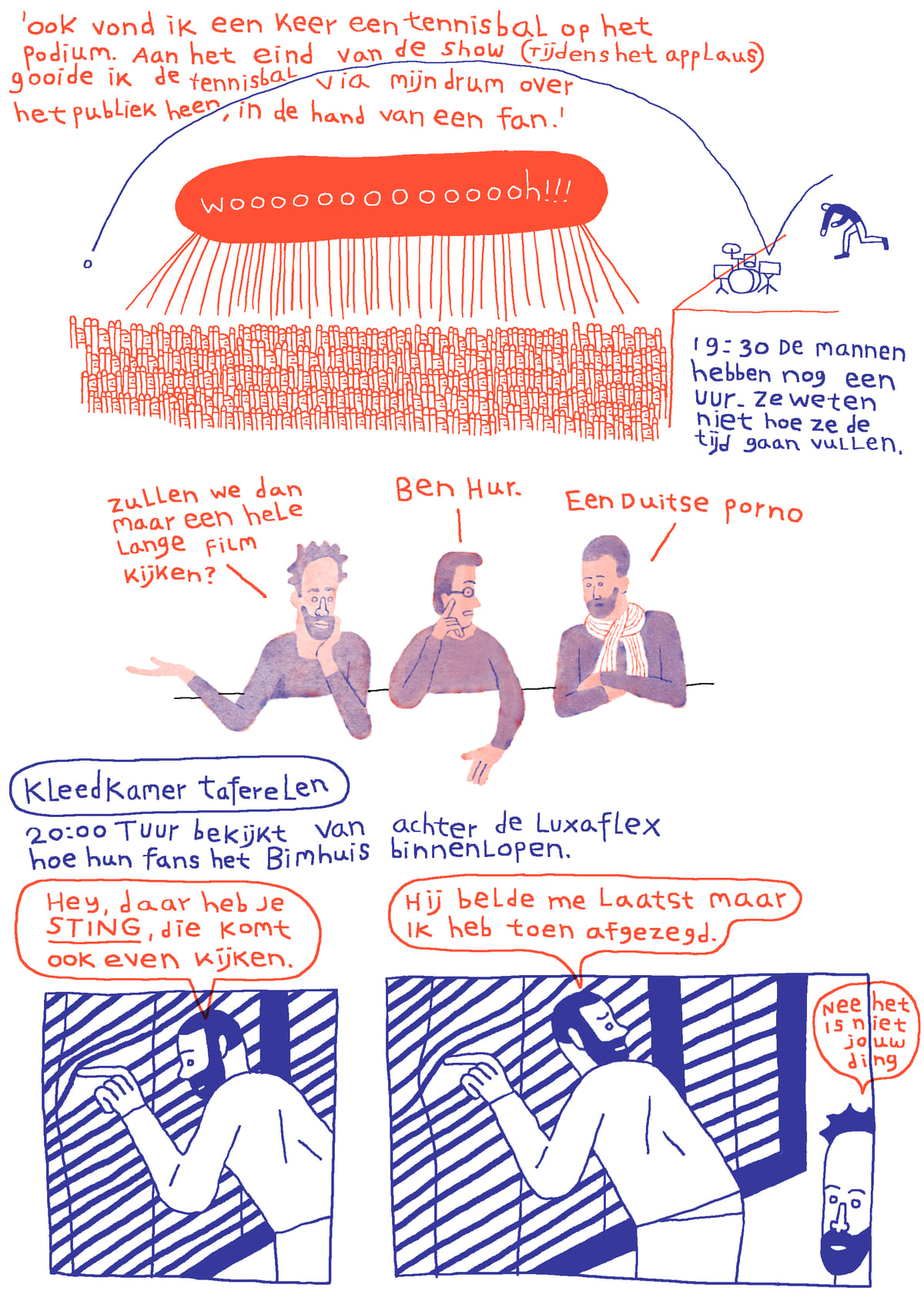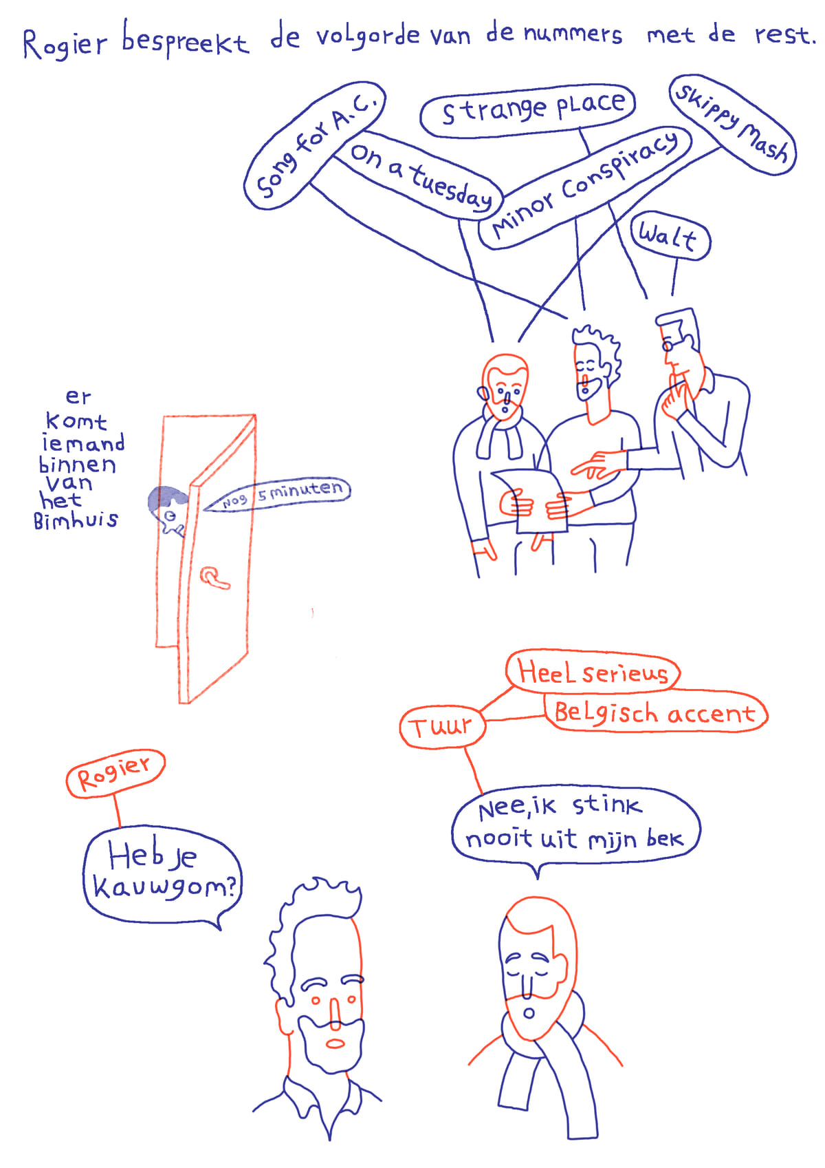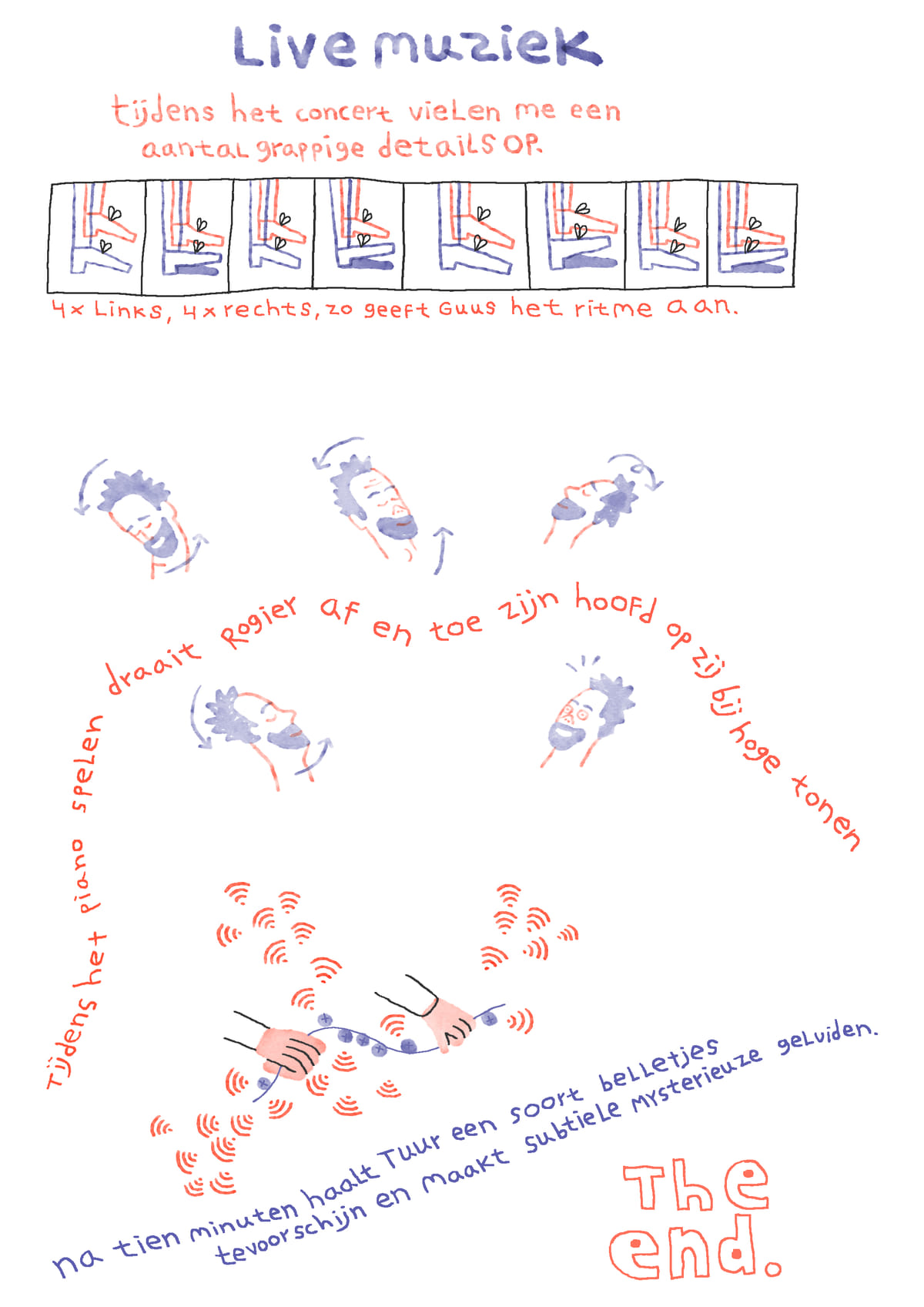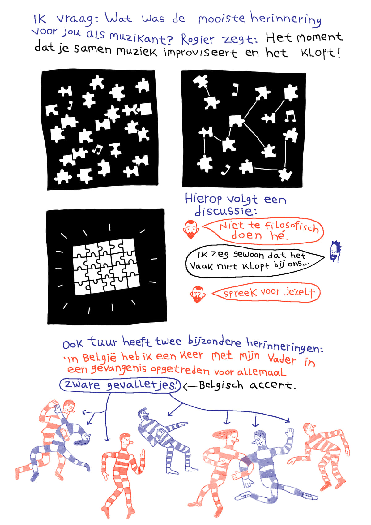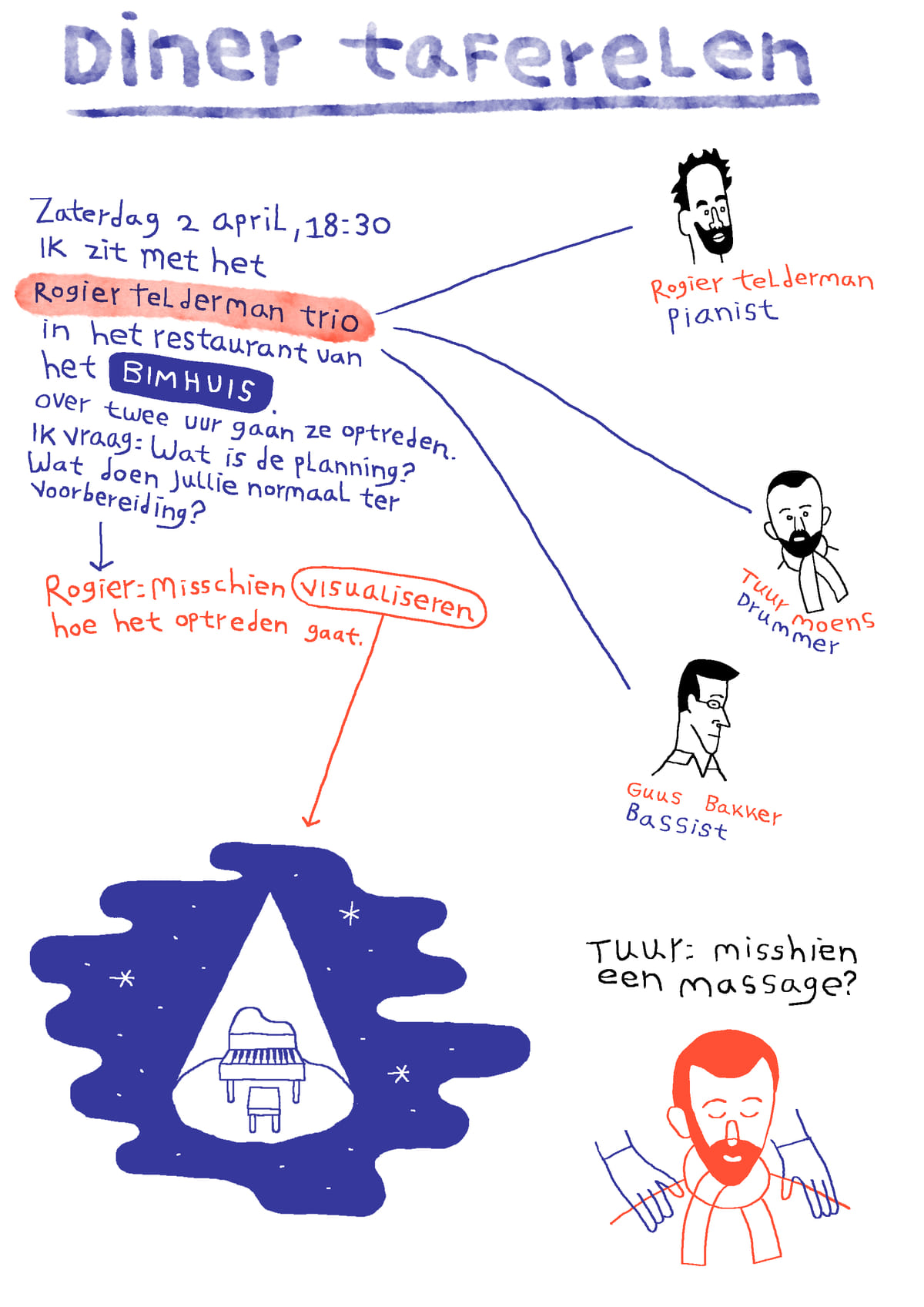 - Illustrator Gijs Henselmans van VPRO Dorst was tijdens de opnamedag van VPRO Vrije Geluiden aanwezig om de jonge jazzmuzikanten Vincent Houdijk en Rogier Telderman te observeren. Daar is een beeldverhaal met VinnieVibes uitgekomen. Gijs is op een ander tijdstip teruggekeerd naar het Bimhuis waar ze 's avonds een dubbelconcert gaven. Dit keer heeft Gijs zich alleen geconcentreerd op het trio van Rogier Telderman. Zie hieronder de rijkelijk geïllustreerde reportage.
