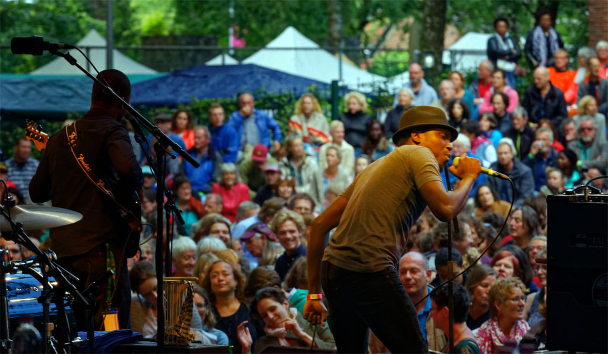 Wat Songhoy Blues net wat anders maakt dan die andere in Europa ook al bekende namen van de woestijnblues als Tinariwen, Bombino en Tamikrest? Ten eerste staan zij niet in Afrikaanse gewaden maar in T-shirts en jeans. Ze beginnen zoals je verwacht van blues, met heerlijke lome ritmes, maar na het eerste nummer slaat dat snel om. Het tempo gaat omhoog. Frontman Aliou geniet met volle teugen en danst alsof zijn leven er vanaf hangt. Regelmatig brengt de zanger van Songhoy Blues in het Engels het onderwerp ter sprake dat ook in veel van hun teksten centraal staat. Muziek verbindt dat is de boodschap. In muziek is geen oorlog en het enige wat Aliou wil, is dat men danst en geniet, zoals hij zelf ook doet. En het lukt de band dan ook om het publiek totaal in te pakken. Mensen dansen, zingen en geven zich over aan deze fantastisch swingende band.