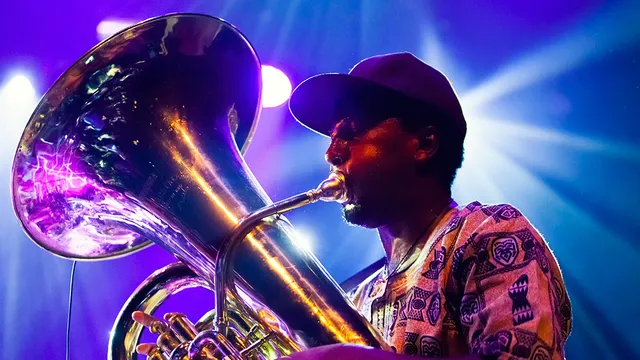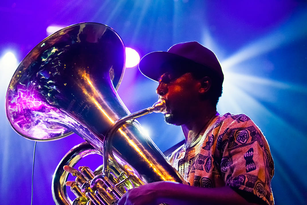 Sons of Kemet onder leiding van rietblazer Shabaka Hutchings heeft de uitzonderlijke bezetting van een saxofoon, een tuba en twee drumstellen. Met een mix van jazz, brass, dub en Caribische en Afrikaanse invloeden creëren ze een stuwend ritmisch geheel.