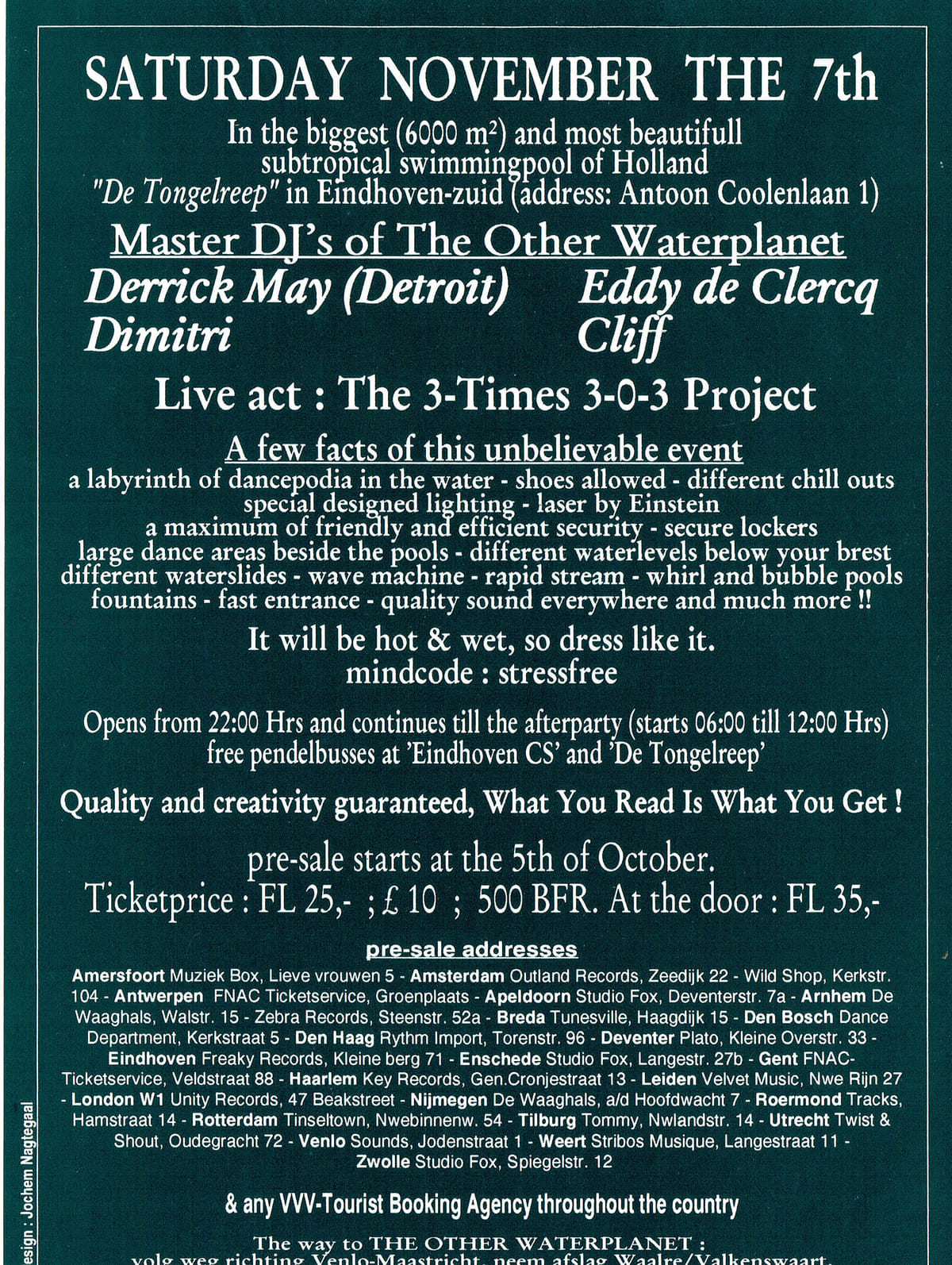 "The Other Waterplanet": een van de grootste techno-raves rondom Eindhoven ooit. Line -up: dj's Derrick May uit Detroit, Dimitri, Cliff en DJ Eddy de Clercq.