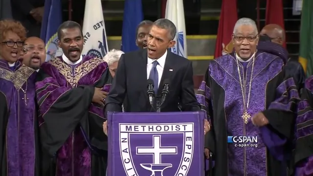 Obama speecht en zingt het lied Amazing Grace op 26 juni 2015 bij de uitvaart van de slachtoffers van een schietpartij in Charleston, South-Carolina.