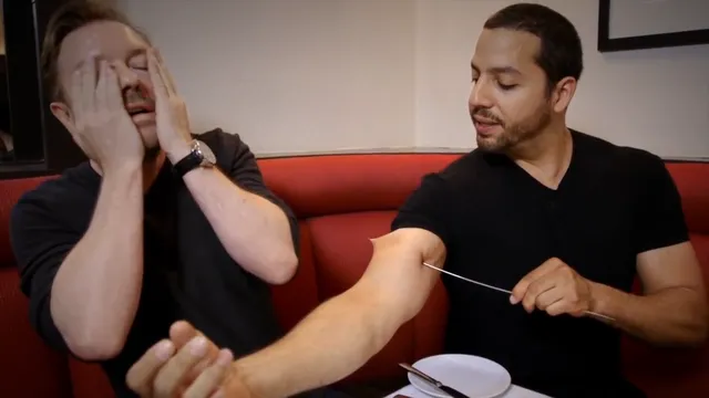 De Amerikaanse illusionist David Blaine steekt een soort breinaald door zijn arm tot verbijstering van Ricky Gervais. Het programma heette David Blaine: Real or Magic Special.