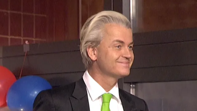 Geert Wilders op een PVV-bijeenkomst in grandcafe De Tijd op het Plein in Den Haag op de uitzslagenavond van de gemeenteraadsverkiezingen 2014. Achter hem staat de Haagse PVV-lijsttrekker Léon de Jong. Wilders vraagt de zaal: willen jullie meer of minder Marokkanen, waarop de zaal ‘Minder minder minder!’ scandeert. Dan zegt Wilders: ‘Dan gaan we dat regelen’.