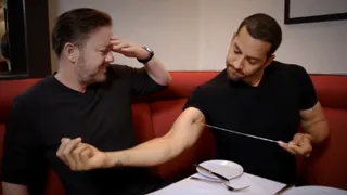 De Amerikaanse illusionist David Blaine steekt een soort breinaald door zijn arm tot verbijstering van Ricky Gervais. Het programma heette David Blaine: Real or Magic Special.