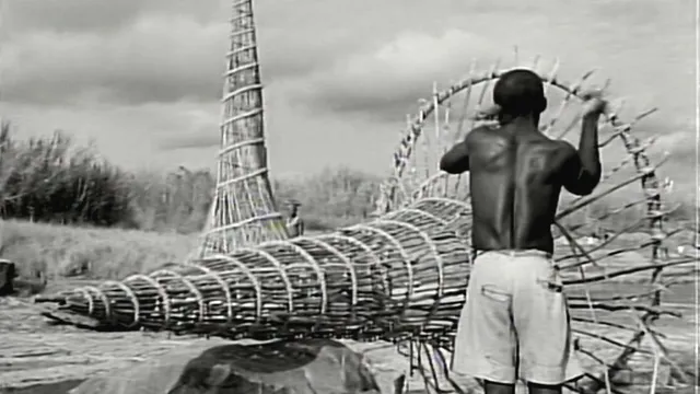 Het fragment laat zien hoe de vissers de rivier op roeien en bij een speciaal hiervoor gebouwde stelling één van hun zelfgemaakte fuiken plaatsen.