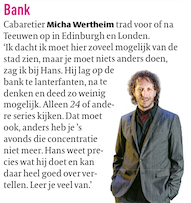 ‘Watching his shows is unlike any other stand- up experience: one minute you are hysterical, the next, you want to hide behind your chair. (...) Hans Teeuwen has all the best tunes.’