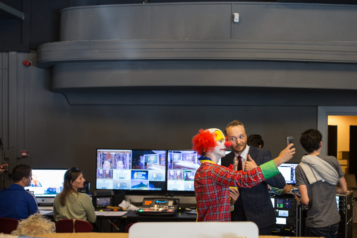 Arjen heeft zich als clown verkleed en neemt een selfie met zijn wassen beeld.© David Cenzer